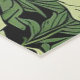Un imprimé feuillage avec un feuille vert clair presque olive ou sage entrelacé dans des verts plus foncés. Une ombre de vert chasseur ou de vert foncé de forêt crée la grande majorité des feuilles. Sur un arrière - plan de noir.