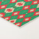 Two images showcasing a rectangular patterned fabric. The top image shows the fabric vertically, and the bottom image shows it horizontally. The pattern features a repeating design with green, red, and white accents on a brown background, creating a festive and intricate look.
