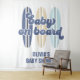 Invitation à une fête prénatale sur la plage avec un bébé sur une planche de surf en bleu.