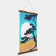 Tapisserie suspendue dans une silhouette d'inspiration japonaise d'un cyprès, encadrant une pleine lune, contre un aqua et un ciel corallien orange
