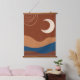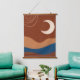 Un paysage lunaire bohème en croissant de lune borde un mur accroché à la tapisserie. Les couleurs sont des tons terre de terre cuite, beige et bleu.
