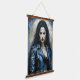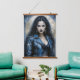 Une femme aux cheveux foncés saisissante aux yeux bleus percevants dégage confiance et mystère, mis en évidence par sa veste de cuir bleu.