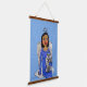 Cette tapisserie aux cintres en bois a un ange brun aux yeux bleus et porte une robe bleue avec des étoiles tenant un chat ange blanc assis sur un nuage sur un arrière - plan bleu ciel.