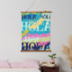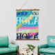 Hola texte répété dans une palette colorée de bleu, jaune, rose, turquoise et vert.