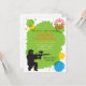 A paintball birthday party invitations that is great for birthdays held at paintball venues. It features the black silhouette of a paintball gunner in a squat position taking aim on the paintball rifle. Target is locked on! Blots and splats of green, yellow and blue paints for the background. Personalize easily with your party details in the green space.