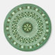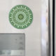 This mandala features a circular, symmetrical pattern with multiple concentric rings. Each ring contains different geometric designs, including dots, lines, and rectangles, all in varying shades of green. The central part of the pattern showcases a circular design with triangular segments radiating from the center, surrounded by a ring of small circles. The outer rings alternate between patterns of dots and rectangular shapes, creating a visually intricate and balanced design. The complexity, symmetry, and detailed geometric patterns make this mandala visually stimulating and meditative.