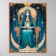 Poster in "The High Priestess", a tarot archetype, seated on an ornate throne, holding a glowing crystal. She wears an intricate headdress adorned with golden accents. An owl, symbolizing wisdom, perches beside her.
