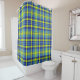 Shower curtain with a blue yellow green tartan plaid checks pattern.