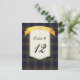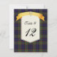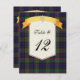 Belle carte de numéro de table de mariage à carreaux écossais réalisée avec le motif tartan coloré violet, noir, vert, rouge et jaune du clan MacLellan. Une zone de texte de couleur crème décorative, au milieu, comporte des graphiques d'un ruban de style bannière jaune doré, en haut. Des graphiques d'un Luckenbooth de ton doré, symbole de l'amour écossais, ornent le milieu du ruban. Le texte en noir est entièrement personnalisable pour répondre à vos besoins de réception. Produits de mariage assortis disponibles. Personnalisez-en un pour chaque table à votre réception de mariage.