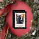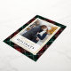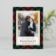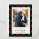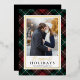 Festive plaid holiday carte photo présente votre image préférée sur un riche arrière - plan plaid rouge et vert bordé d'une feuille dorée brillante. "Happiest Holidays" apparaît sous le script en feuille d'or et en lettres serif noires, avec votre nom de famille et l'année en noir classique.