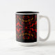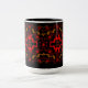 Cette tasse comporte une conception abstraite primitive de foudre et de soleils dans des tons de la terre d'orange, de rouge, de noir et de brun.