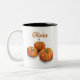 Prenez une boisson chaude avec une touche d'automne. Cette tasse à café élégante présente des citrouilles d'aquarelle modernes dans des tons oranges chauds, accentués d'un nom de script élégant. Une ode cosy et contemporaine à la saison.
