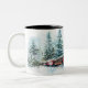 Celebrate the magical and festive holiday season with our personalized photo mug. Our vintage holiday design features a farm landscape of Christmas trees, this Christmas pattern features a farm Christmas scene with a farm, a red barn, children playing and throwing snowballs, Christmas trees and a red vintage truck