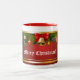 Décor élégant de vacances avec des boules de Noël, des arcs de soie et des cloches d'or, entourés par les branches d'arbre à feuillage persistant de Douglas-sapin au-dessus d'un arrière - plan rouge. Personnalisez cette tasse utilisant votre propre texte et fournissez un beau message à quelqu'un cher !