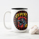 Une grande tête de coq est exposée de façon centrale avec des caractéristiques exagérées et des couleurs vives, accompagnée d'un texte jaune en gras "CLUCK! ! IT !" dans un design circulaire. L'arrière - plan présente des lignes rouges rayonnant vers l'extérieur sur un cercle sombre sur fond gris.