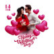L'image montre une tasse blanche à l'intérieur noir. La tasse présente un design avec un couple d'embrassades, entouré de graphismes de coeur rose. Le texte "14 FEB" est écrit sur le côté gauche du couple, et "Heureuse Sainte-Valentin" est écrit en bas dans une police décorative. L'image est pertinente car elle représente une tasse sur le thème de la Saint-Valentin, qui pourrait être un cadeau populaire pour l'occasion.