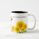 Cette tasse de café en céramique est montrée avec une jolie reproduction d'art de la vache country et des tournesols. Customisez cet objet ou achetez tel quel.