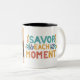 savourez chaque instant une tasse de café à deux tons Un design typographique coloré avec la citation motivante "SAVOR EACH MOMENT" entourée d'éléments décoratifs en forme de feuille sur un arrière - plan sombre. L'utilisation de couleurs vives et d'embellissements artistiques rend cette image visuellement attrayante et inspirante.