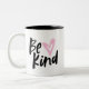 Écriture brossée Be Kind avec accent du coeur, tasse à café à deux tons.