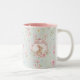Whimsical Bunny Teapot Floral Spring Two-Tone Coffee Mug. This design features a delightful whimsical bunny nestled within a pink teapot, surrounded by spring blossoms and green foliage. This floral pattern brings a touch of spring magic to your everyday sips. Perfect for tea, coffee, or hot cocoa, it makes a delightful gift for Easter, Mother's Day, birthdays, or any occasion for a bunny lover.