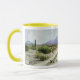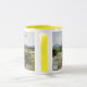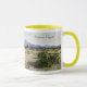 Cailles de Santan : La tasse de café à deux tons (la poignée en céramique, de jaune et la jante blanches) avec des cailles de Santan conçoivent, vue de déserts de l'Arizona des montagnes de Santan, graphique numérique du corpus Omphalos de livre, poésie et collection d'art 2012, par Mary Elizabeth Kibler, auteur/artiste