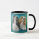 C'est une tasse en céramique, comportant une photographie d'une peinture originale de deux épagneuls cavaliers du Roi Charles, un tricolore, et l'autre Blenheim, séance ainsi qu'arrière - plan bleu/vert.