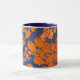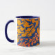 Tasse blanche avec jante et poignée bleu foncé, décorée de poissons orange sérigraphiés sur un arrière - plan bleu foncé