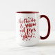 Cette tasse lit un petit poème de saison : "Chocolat chaud & neige et feux d'aglow".... parce qu'il n'y a pas de sensation plus chaude que de déguster du chocolat chaud devant un foyer pendant qu'il neige dehors! La typographie dessinée à la main est colorée en rouge foncé et entourée de flocons de neige.