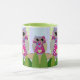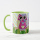 Cette tasse a une conception d'illustration vectorielle avec un Chouette mignon sur une branche et des feuilles. Les hiboux sont décorés de coeurs ainsi que de motifs fleuris et géométriques (pois, chevrons). L'arrière - plan rayée est aux couleurs pastel douces. Les couleurs sont rose, violet, vert, bleu et jaune. Ce produit peut être customisé en ajoutant du texte.