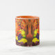 Une tasse avec ma conception d'un citrouille assis au milieu du jardin d'automne favoris comme la courge, les pommes, le raisin, les pommes et les oranges, avec les feuilles d'automne et les cônes de pin.