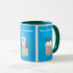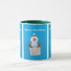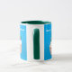 Une tasse à rondelle blanche festive avec une jante et une poignée verte sainte et des panneaux de bleu vif avec Joyeux Noël en blanc, juste en dessous du bord. Dans chaque panneau est un cupcake, surmonté d'un gel blanc et saint, un arbre de Noël avec des lumières et une étoile et un Père Noël!