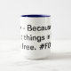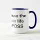 tasse de café 15oz, blanche avec la poignée et la jante bleues. A le texte "Linux - puisque les meilleures choses dans la vie sont libres. #FOSS". le #FOSS représente libre et le logiciel libre. Linux est un système d'exploitation alternatif pour des ordinateurs. Les versions communes incluent Ubuntu, Fedora et la menthe qui sont source libre et ouverte.