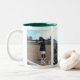 C'est une tasse de café à deux tons avec trois images différentes de la voie de course de Keeneland à Lexington, Kentucky.