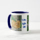 Tasse blanche avec la poignée bleu-foncé et jante, décorée de deux portraits d'un chat de gingembre, pris d'une peinture en pastel originale par Judy Adamson. Les mots (dans bleu-foncé) lisent, "OK de RÈGLE de CHATS !.