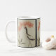 Une grue de huée prolonge son cou vers le haut pour atteindre une orchidée surdimensionnée dans la conception Asiatique-inspirée sur cette tasse. La grue est identifiée avec le noir sur son cou et ailes et par le rouge sur son visage et tête. L'orchidée de phalaenopsis est orange pâle avec le feuille vert-foncé à la base de sa tige courbante. L'arrière - plan beige profond et l'aspect affligé donnent à l'image le regard d'une peinture antique sur le papier qui s'est fané au cours du temps. De mon image numériquement créée d'original.