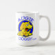 Cette tasse de café comporte le logo d'AugieDoggy.com d'un chien de golden retriever de bande dessinée dans des couleurs bleues et jaunes lumineuses.