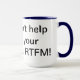 Tasse 15oz blanche avec la poignée et la jante bleues. A le texte "non, je ne vous aidera pas à fixer votre ordinateur. RTFM !" Ceci vient d'être un maître très frustrant de Web involontairement indiqué L'appui.
