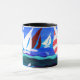 Une tasse de sonnerie, des blanches avec la poignée et la jante noires, la conception de bateaux à voile est faite à partir d'un collage de papier peint à la main.