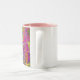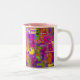 Café ou thé de boissons ? Essayez cette tasse mignonne et colorée de flower power de deux tons ! Cette tasse dépeint une image de mon collage de médias mélangés de flower power d'un côté, et est colorée rose sur l'intérieur. Elle comporte une fleur tirée par la main colorée et un oiseau jaune mignon avec de longues jambes rayées noires et blanches. Ces caractères se reposent placé sur un arrière - plan de divers papiers et peintures décoratifs colorés dans le rose, le pourpre et l'orange. Comme des parties scintillantes finales de contact fleurissent et différent colorez les papillons accomplissent le morceau.