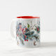 Les oiseaux sur le pin s'embranche avec des baies et des cônes de pin sur un fond en bois clair. Vitré à l'intérieur en rouge. Donnez ce cadeau d'amusement à un ami, ou ajoutez à votre collection de vacances. Construction, micro-onde et coffre-fort forts et en céramique de lave-vaisselle.