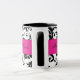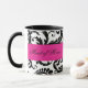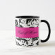 Cette tasse noire et blanche chic de damassé avec une rose indien réunissent des matchs le faire-part de mariage montré ci-dessous et sont customisées pour votre domestique d'honneur. Elle ferait un souvenir gentil pour vos toutes les dames à votre noce, ou pour n'importe qui qui a aidé à rendre votre jour du mariage extra spécial. Le texte est personnalisable, et vous pouvez choisir d'une série de styles et tailles de tasse.
