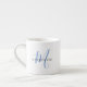 Elégante Coupe d'Espresso Monogramme Blanc Moderne. Un élégant monogramme de script bleu combiné à une police de caractères noir propre san-serif donne un look contemporain.