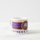 Espresso Cup 6oz. blanc avec des cercles concentriques violets et or avec "CENTRE DE L'UNIVERS" et "HOLLYWOOD, CALIFORNIE" en bas. Avec le Grand Sceau de Californie au centre. Ce design est un cri d'alarme pour la ville incomparable, Hollywood, Californie.