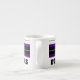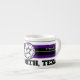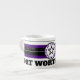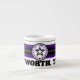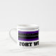 Espresso Mug 6oz. blanc avec des cercles concentriques noirs et violets design avec "FORT WORTH, TEXAS CENTER OF THE UNIVERSE" avec une étoile solitaire au centre du cercle. Cette conception est un cri à Fort Worth, Texas, une ville en mouvement. Ils l'appellent Cowtown.