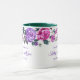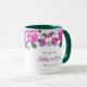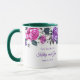 Cette tasse florale comporte des roses violettes et roses avec des feuilles vert émeraude de mer autour du bord supérieur de la tasse sur un fond blanc. Texte violet en attente de votre personnalisation. L'intérieur de l'exemple présenté est vert. Choisissez la couleur de l'intérieur qui vous convient. Personnalisez cette tasse ou achetez-la telle quelle.