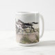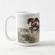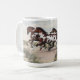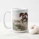 Cette tasse comporte des illustrations originales de trois chevaux de peinture galopant à travers un paysage de désert par l'artiste Jayne Wilson
