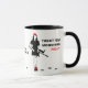 Joyeux texte d'Halloween de couleur noire dans la partie centrale de la tasse. Une silhouette noire d'un horrible zombie, texte rouge Traitez-moi, texte noir Bro à droite de l'image à gauche. Silhouette d'une jolie jeune femme avec un fusil sniper dans les mains et un texte Traitez-les les monstres à droite. Certaines cartouches vides sont éparpillées dans la partie inférieure de la scène. Drôle tasse à café unique pour n'importe qui. Entièrement personnalisable. Vous pouvez modifier toutes les images et tous les textes. Utilisez le bouton Personnaliser pour ajuster le produit à vos besoins et à vos souhaits personnels. Amusez-vous et faites-en un.