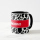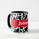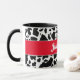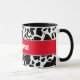 Impression de vache noire et blanche pour une touche occidentale que n'importe quelle cow-girl aimerait quand vous ajoutez son nom à la frontière rouge rayée blanche sur la tasse à thème de ce pays.