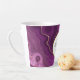 Une tasse en latte au design abstrait élégant. Couleur améthyste violet foncé avec des rubans d'or nichés entre des strates stratifiées. Un design riche et magnifique. En haut, un cadre en cercle blanc avec une fausse bordure en feuille d'or, avec votre initiale et votre nom monogramme personnalisés à l'intérieur.
