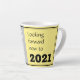 Mug de café NOUVELLE ANNÉE moderne et minimaliste montrant des moitiés gris argenté et jaune pâle avec de fines bordures noires. Le texte dit 2020 FAREWELL IT'EST FINI ET FAIT, REGARDANT AVANT MAINTENANT À 2021. D'un côté il y a une HAPPY NEW YEAR verticale, qui est PERSONNALISABLE pour que vous puissiez personnaliser avec votre nom ou votre propre salutation. Un élégant mug de Nouvel An pour dire adieu à 2020 et pour embrasser le Nouvel An à venir. Disponible en d'autres couleurs.
